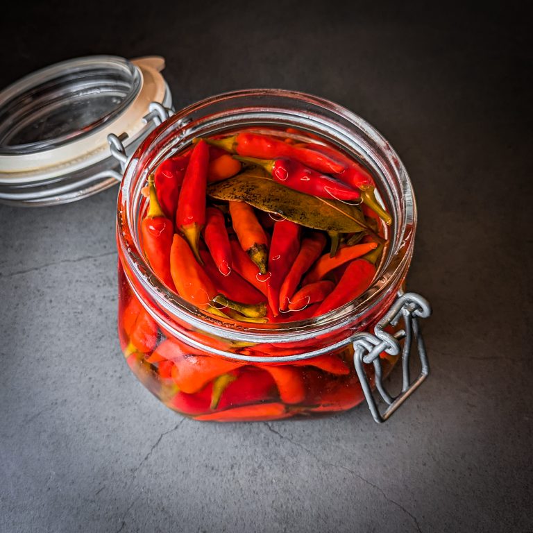 Die Chilis halten sich im Kühlschrank so gut wie ewig, wenn man darauf achtet, das Glas