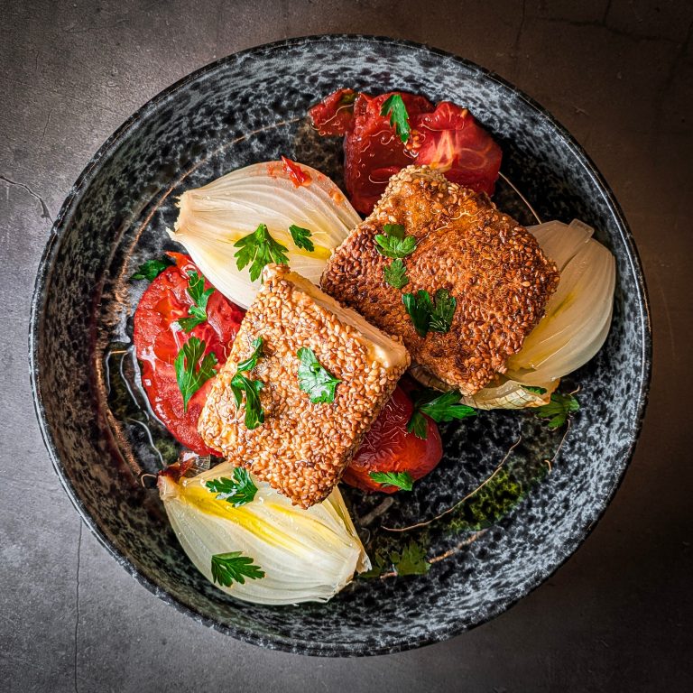 Für den Feta die Eier in einem tiefen Teller verquirlen. Mehl und Sesam jeweils auf einem Teller verteilen. Den Feta in vier Scheiben schneiden, zuerst im Mehl wenden, dann durch die Eier ziehen und abschließend in den Sesam drücken, damit er rundherum überzogen ist.