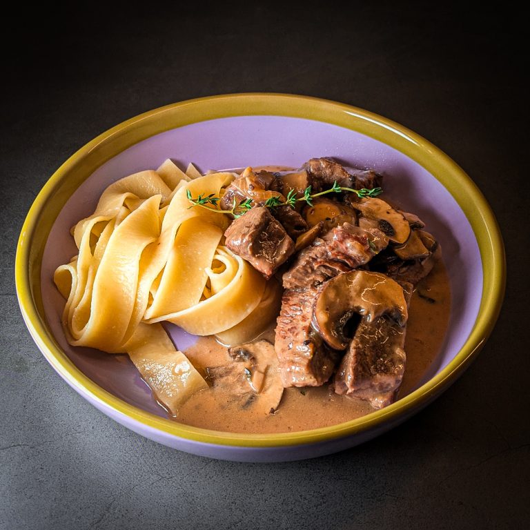 3 Die Fleischstücke wieder in den Topf geben, mit dem Mehl bestäuben und gut vermengen.