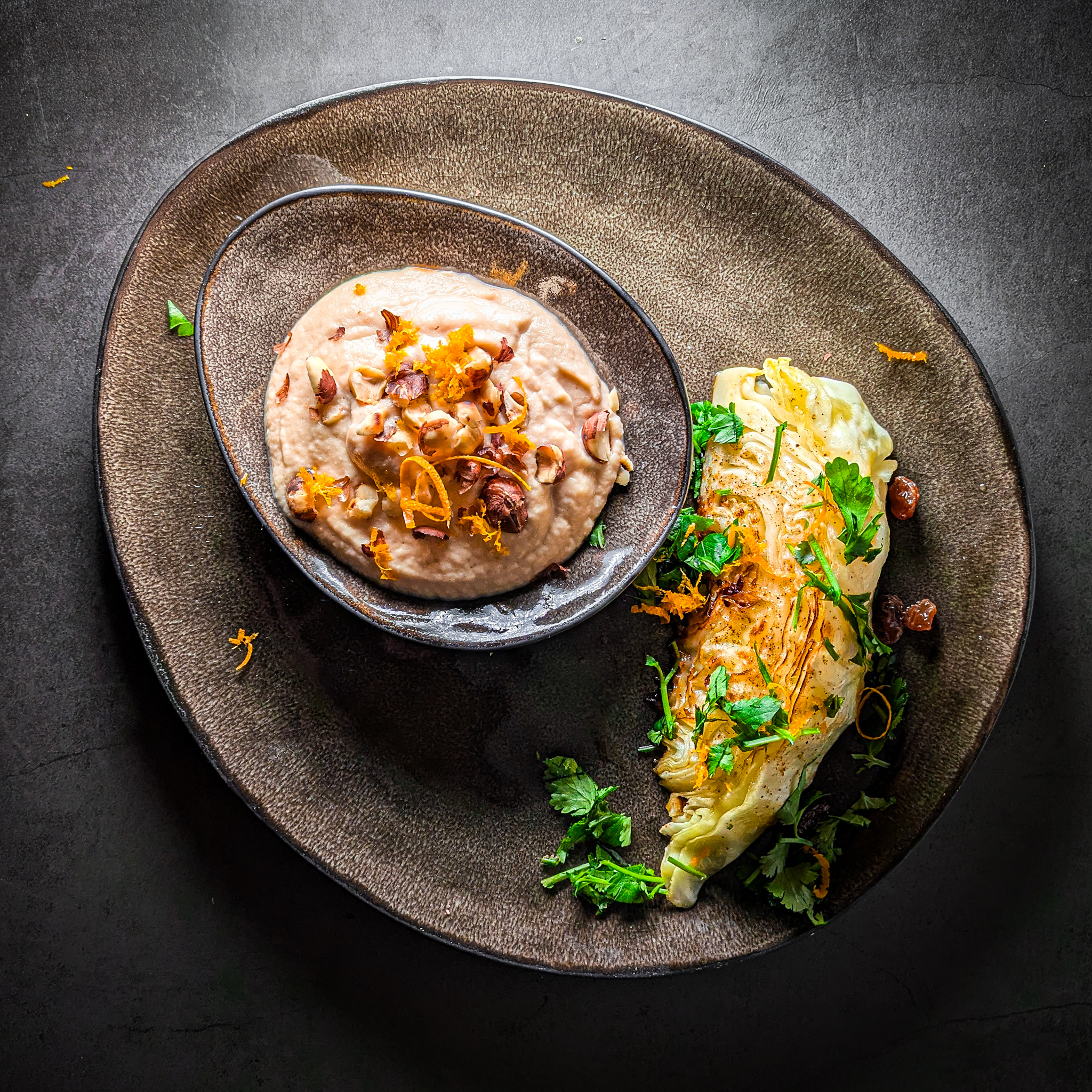 Gebratener Spitzkohl mit Sellerie-Haselnuss-Pürree
