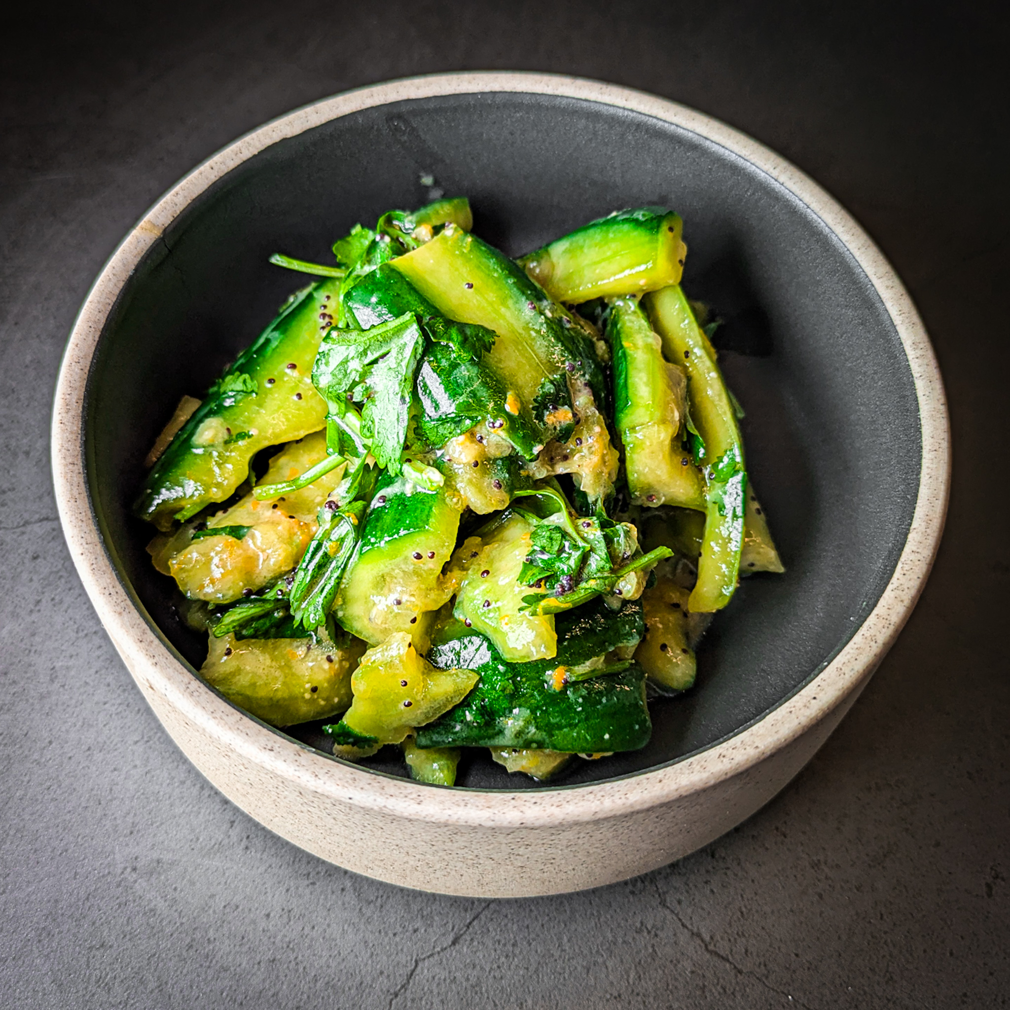 Geschlagener Gurkensalat mit Miso-Mohn Dressing