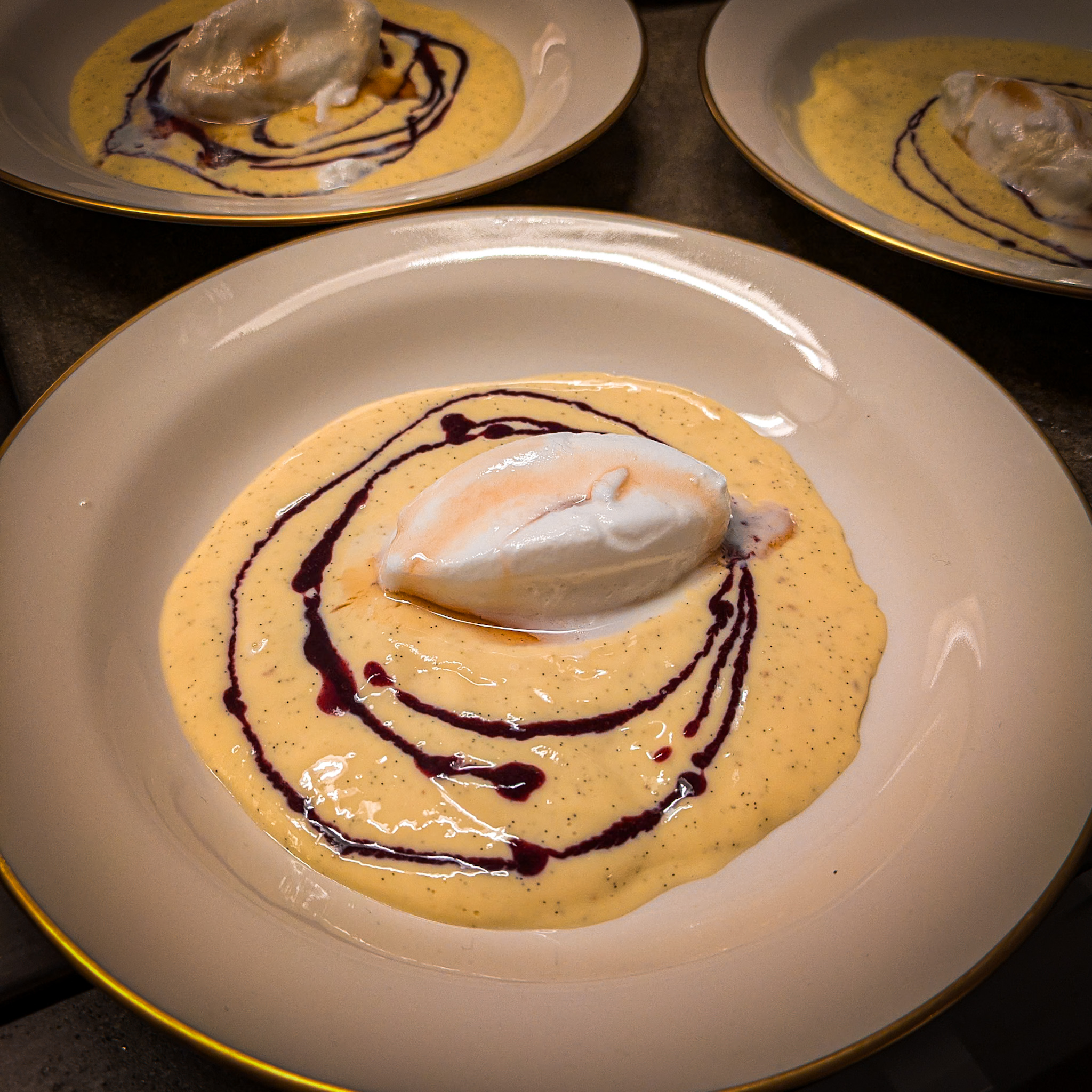 Etwas Crème anglaise auf jeden Teller geben und mit je 1 EL Blaubeersauce marmorieren.