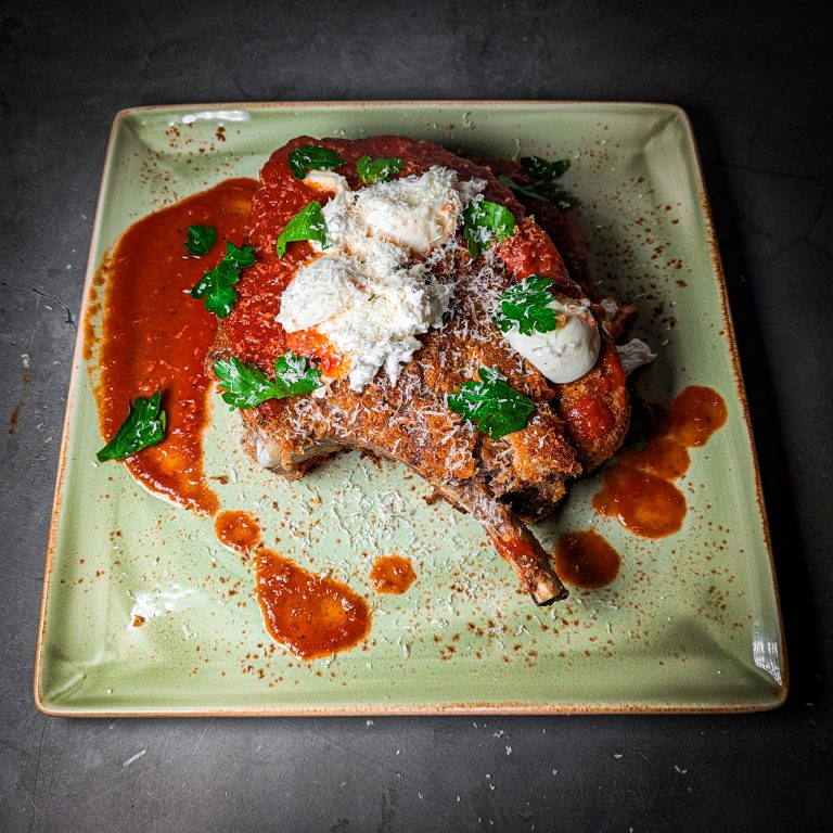 im Ofen etwa 5 Minuten ruhen lassen.Zum Anrichten die Koteletts auf Teller legen, ein paar Löffel Sauce darauf verteilen, den