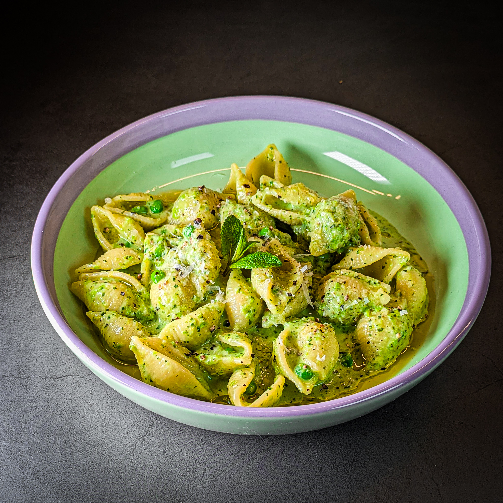 450 g Muschelpasta in den Topf mit dem kochenden Wasser geben und nach Packungsanweisung al dente kochen. 1 Minute, bevor die Nudeln fertig sind, die restlichen 75 g TK-Erbsen in den Topf geben. Pasta und Erbsen abgießen und einen großen Löffel Nudelwasser zurückbehalten.