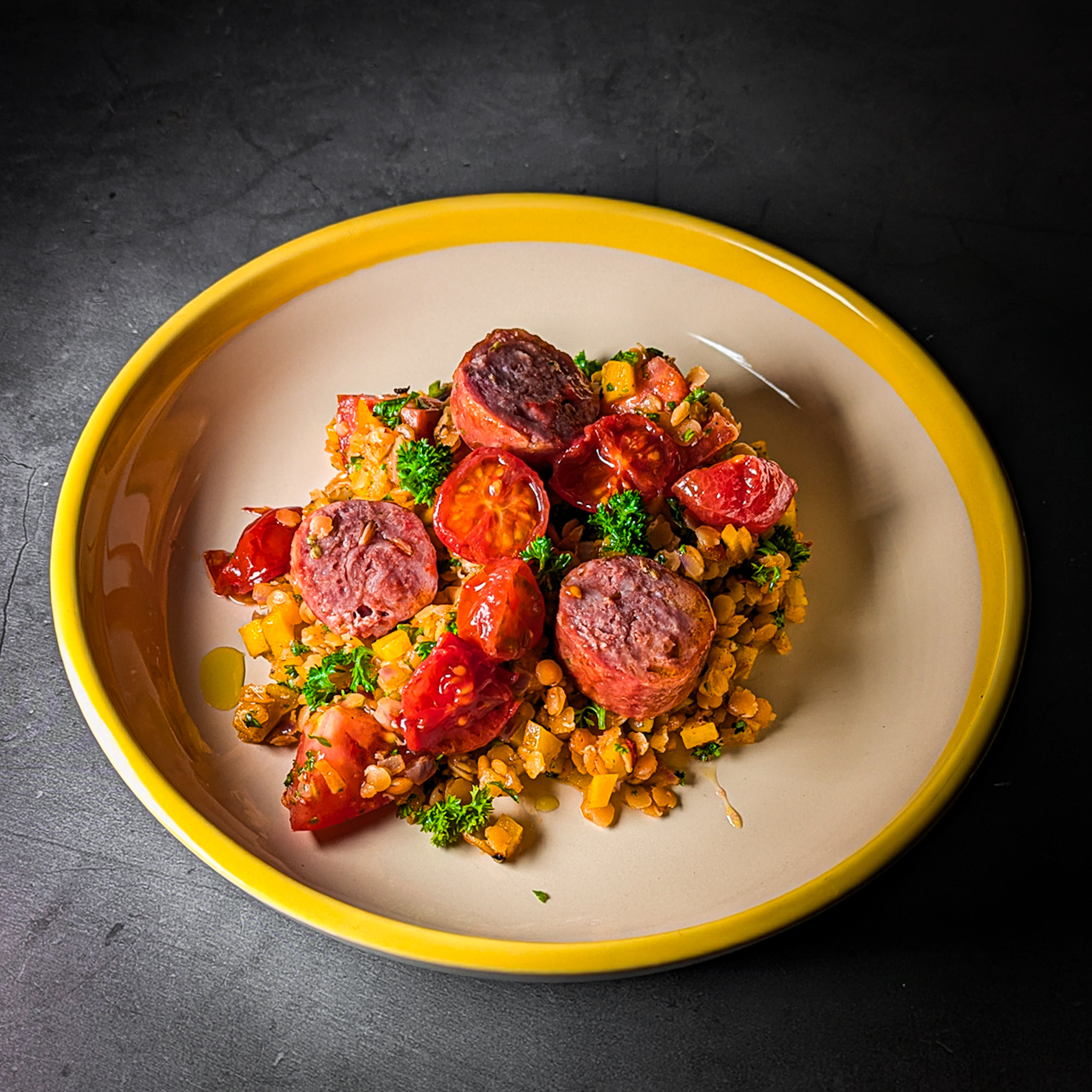 Orientalischer Linsensalat mit Merguez und confierten Tomaten