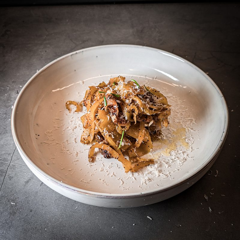 Möhren-Tagliatelle in Mohn-Balsamico-Sauce
