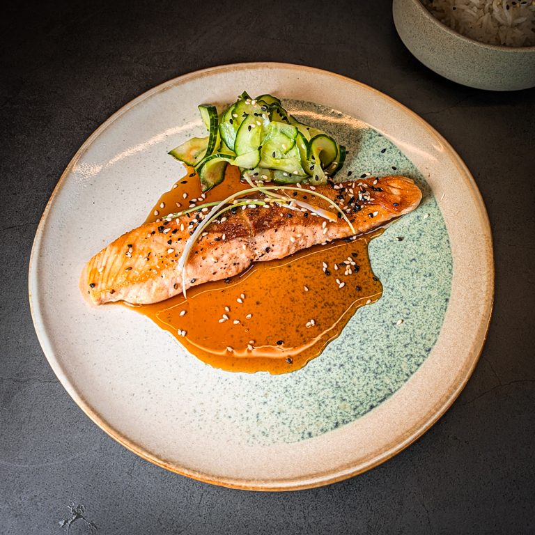 Die Lachsfilets mit Salz und Pfeffer würzen. Eine Pfanne auf mittlerer Stufe erhitzen und die Lachsfilets auf der Hautseite in etwas Rapsöl darin braten. Sobald die Haut knusprig ist, alle weiteren Seiten für 2 Minuten braten, sodass der Lachs innen noch glasig bleibt.