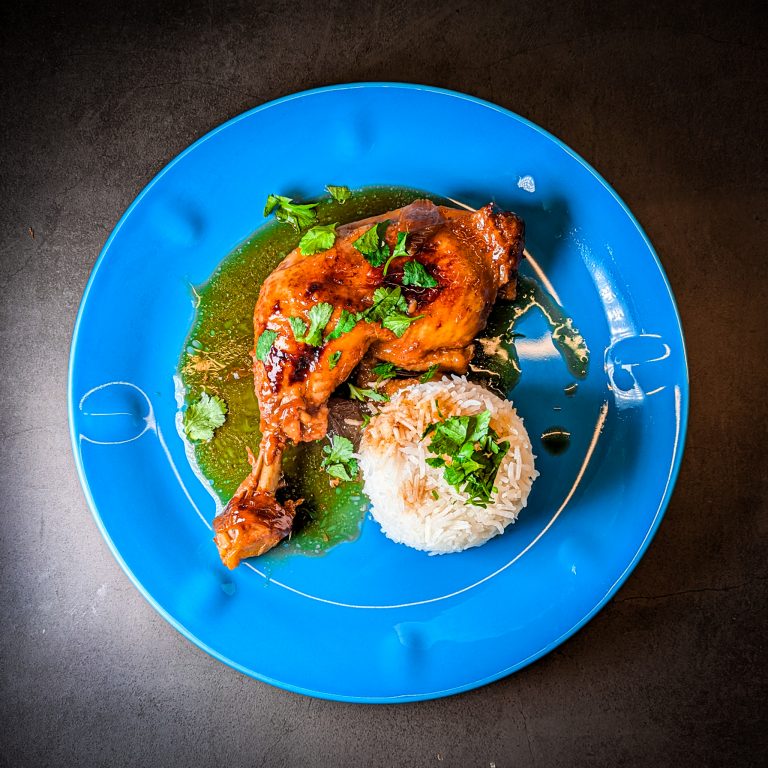 Das Huhn mit der Sauce und gedämpftem Reis, garniert mit Koriander und geröstetem